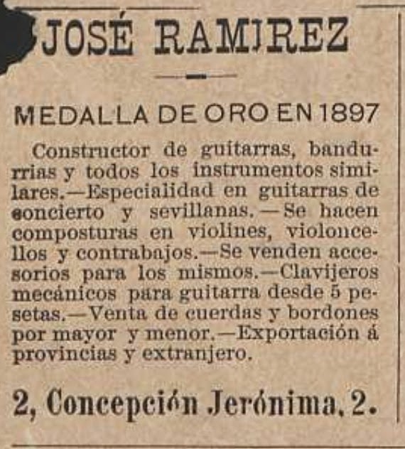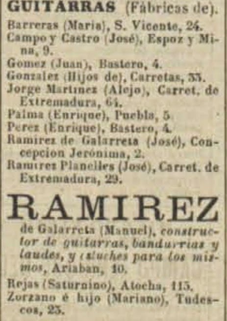 Although the truth is that I would not dare to say that he really started from scratch because there is a family history of professional musicians, even the existence of a contemporary guitar maker. He lived in Logroño, in the number 52 of Mayor Street, around the year 1890, and he was certainly his brother. According to our latest research, his name was Antonio Ramírez de Galarreta y Planells. Maybe, if we follow the track of this information we will get to know interesting facts that I will be delighted to share if I have more precise information.*