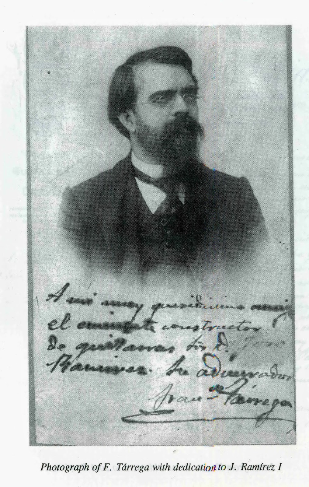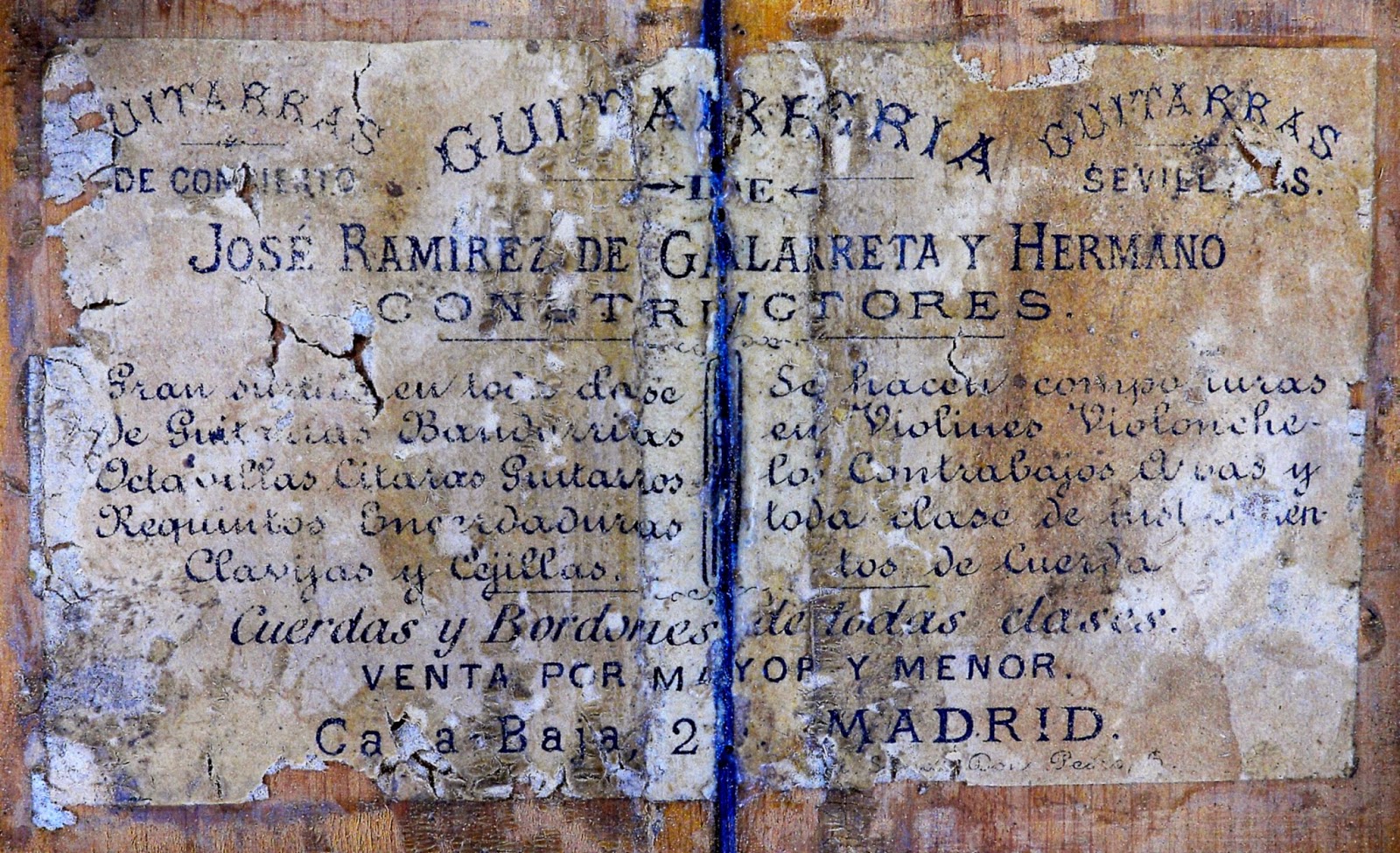 * For their collaboration thanks to: Pablo de la Cruz for his historic contribution about José Ramírez and his friendship with Torres and his relationship with Tárrega. Anselmo Lanzas for providing me with the information about the brothers’ two Tablao Guitars that he treasures in his collection. Félix Manzanero for opening the doors of his workshop-shop to show us a really special guitar from his collection, the one that says in its label: ‘José Ramírez de Galarreta and brother’ in La Cava Baja 24, that I mention in this article. José Juan Fernández who discovered us Antonio Ramírez de Galarreta y Planet, guitar maker in La Rioja and brother of José and Manuel. I also thank Xosé Crisanto because he is a rich source of information about this house due to his tireless investigation. Within the same field of investigation, I am grateful for the contribution of our friend José Juan Fernández about the coming into stage of Antonio Ramírez de Galarreta y Planells, guitar maker in Logroño. And of course, to Miguel Martínez; he is not only lending us his memories of the history of this house, but he also came with us to Félix Manzanero’s workshop with his inventions to make excellent pictures of the inside part of the guitar of the “compulsive impressions” of Manuel’s stamp.