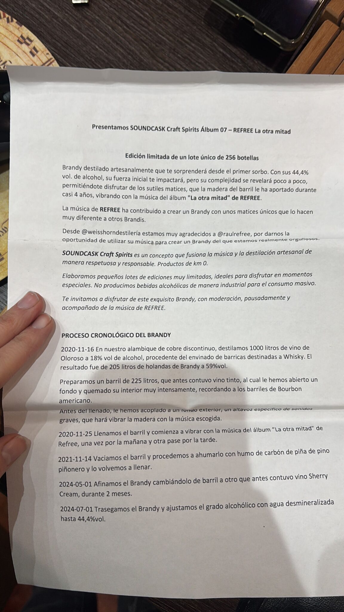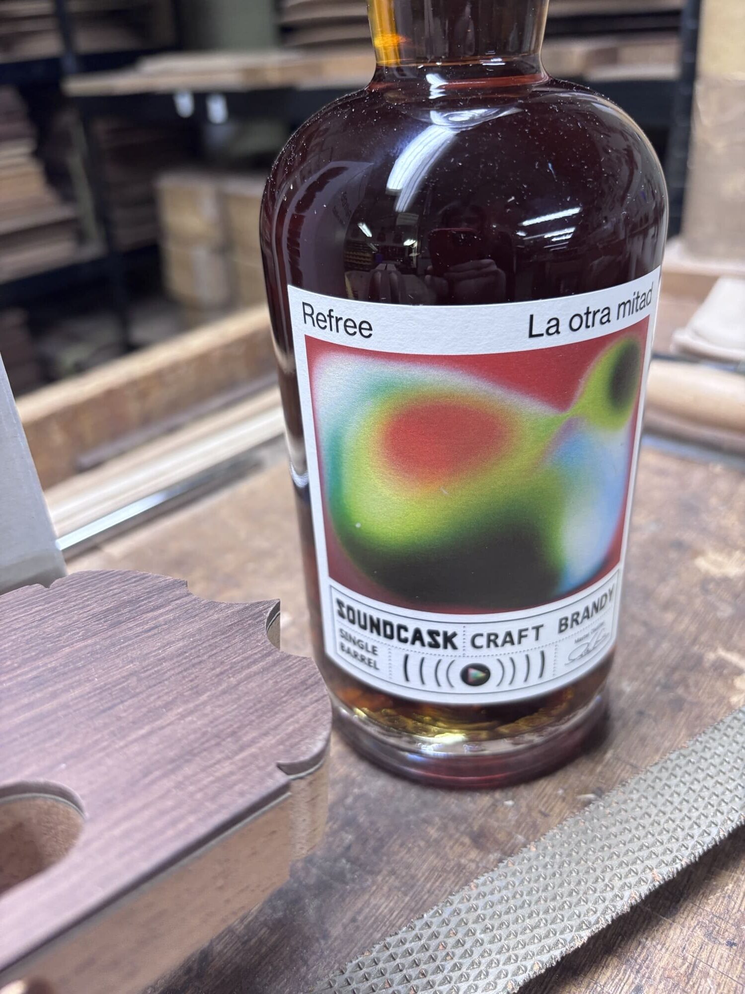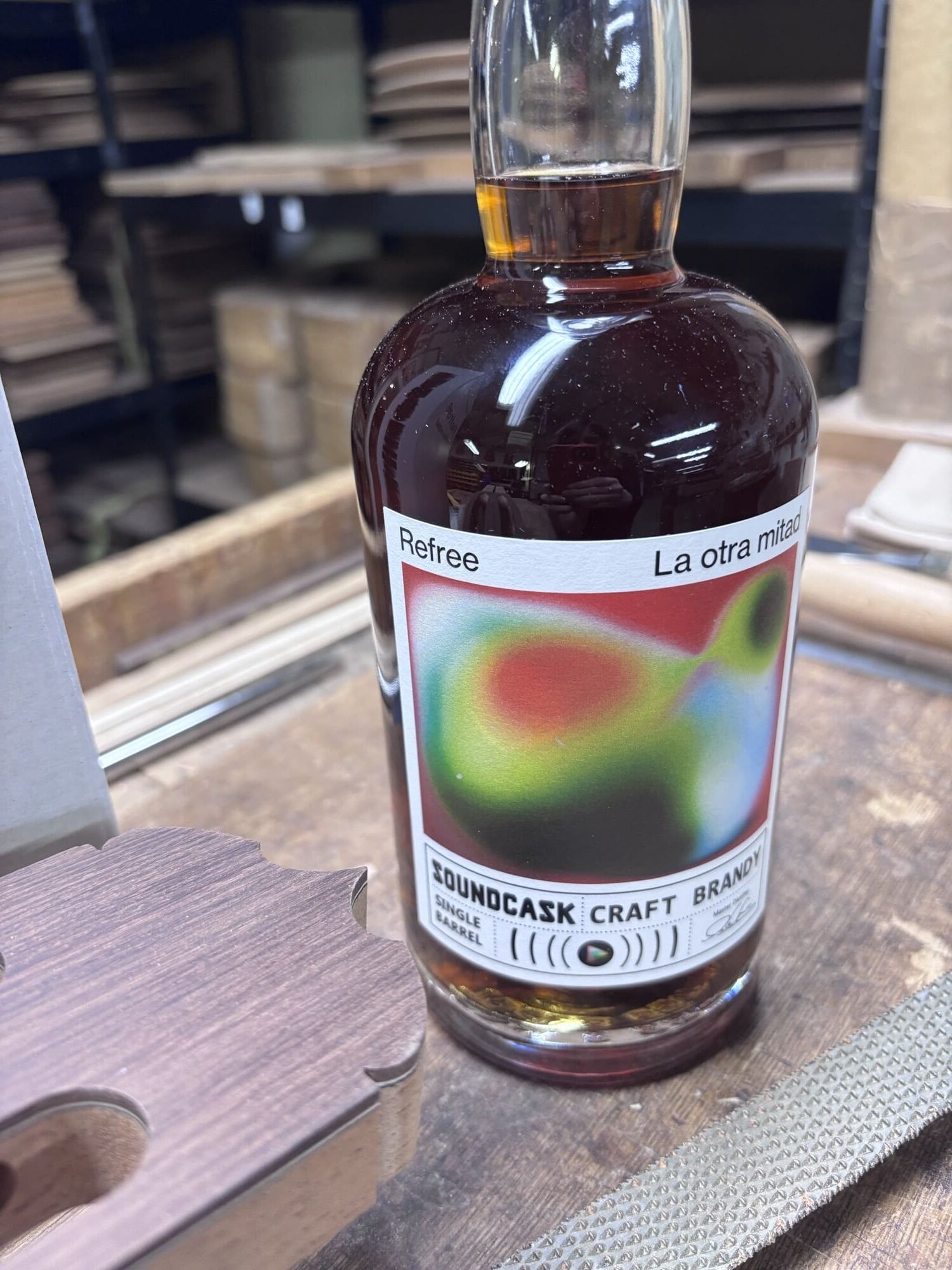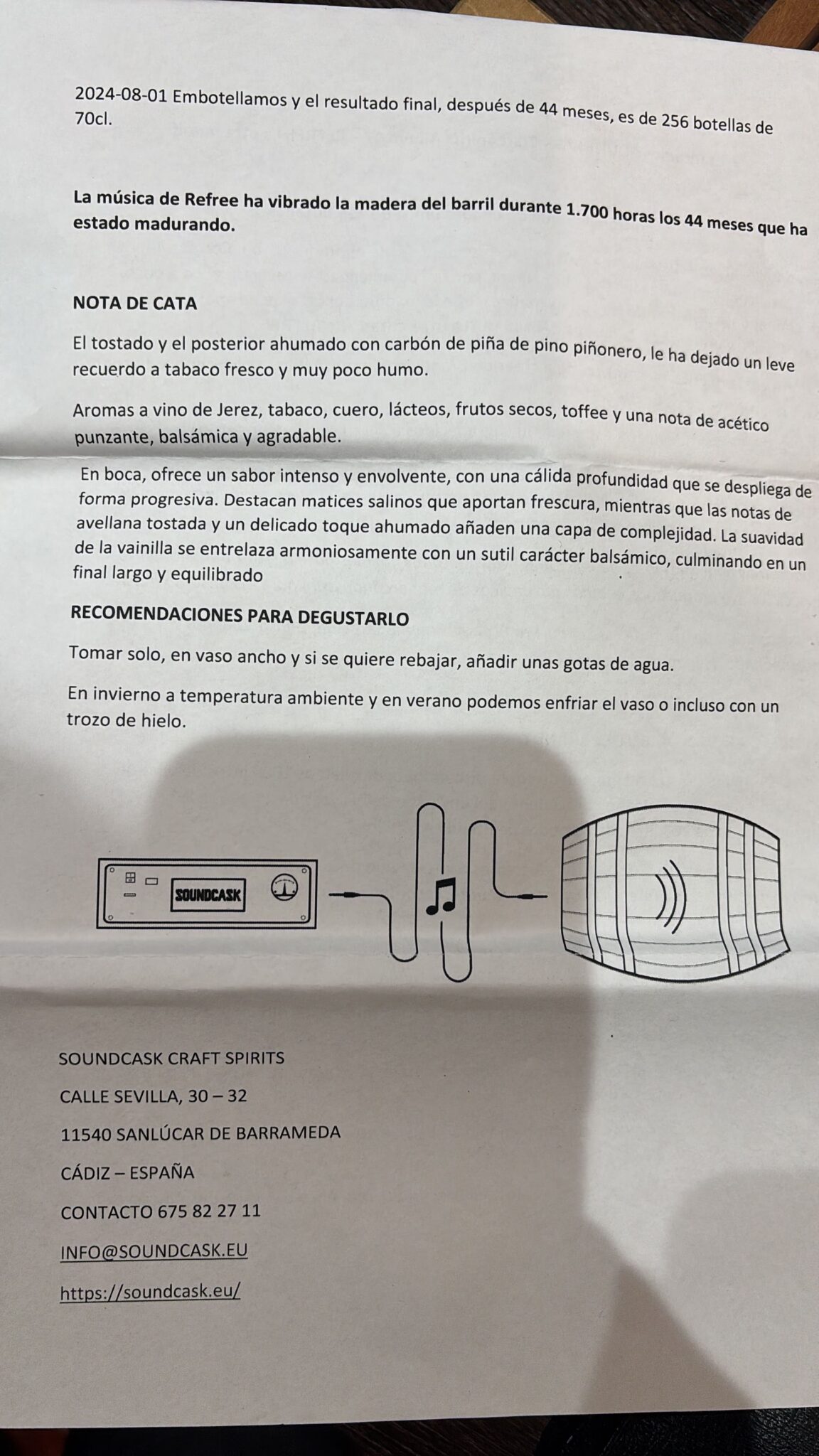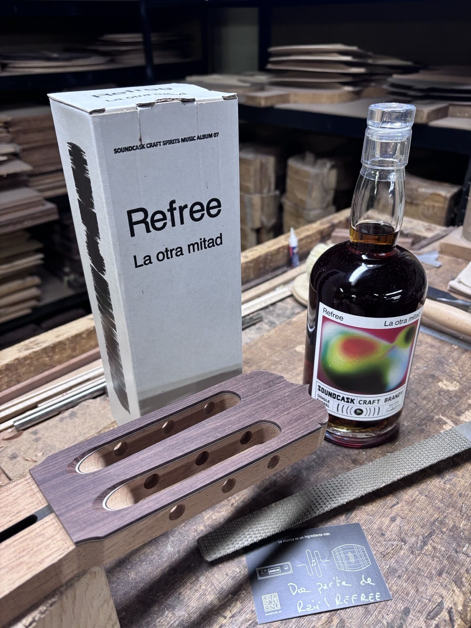 Este proyecto, impulsado por Sound Cask —empresa pionera en el envejecimiento de bebidas con vibración musical—, une la pasión de tres mundos: la luthería, la producción musical y la destilación tradicional. En esta edición especial, la pieza interpretada por nuestro amigo, el reconocido músico y productor Raül Refree fue grabada con una guitarra Ramírez Tablao, y reproducida durante el proceso de maduración del brandy, en contacto directo con las barricas.