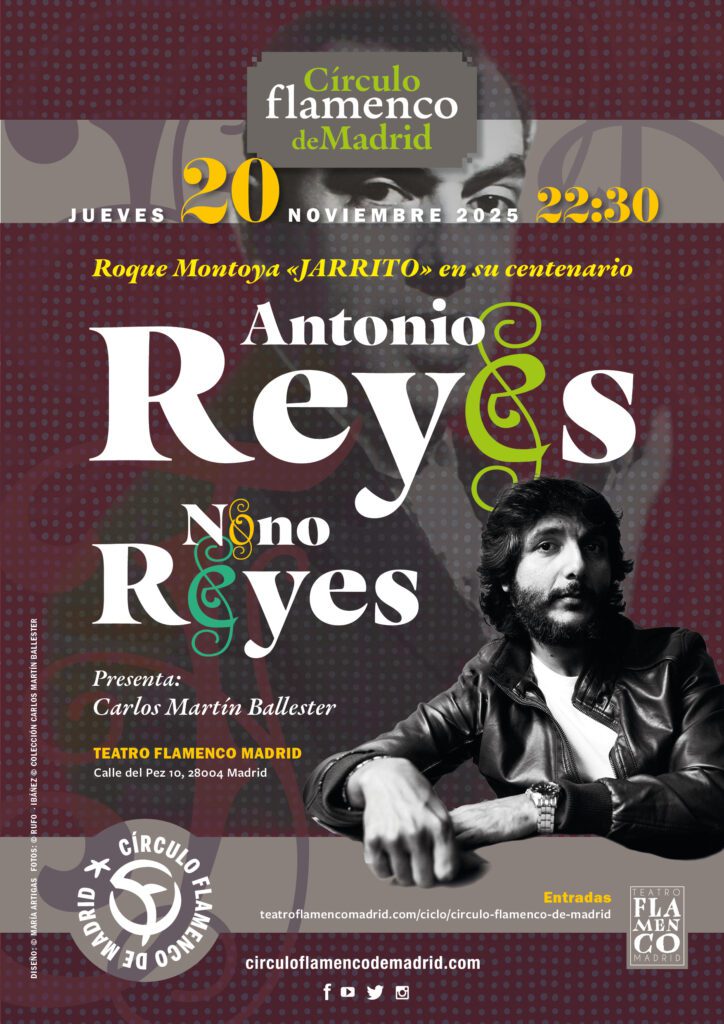 La decimotercera temporada del Círculo Flamenco de Madrid continúa el próximo jueves 20 de noviembre con una jornada doble dedicada a Roque Montoya “Jarrito” en su centenario. La noche cerrará con un concierto muy especial a cargo del cantaor Antonio Reyes, acompañado por el guitarrista Nono Reyes, en el escenario del Teatro Flamenco Madrid.