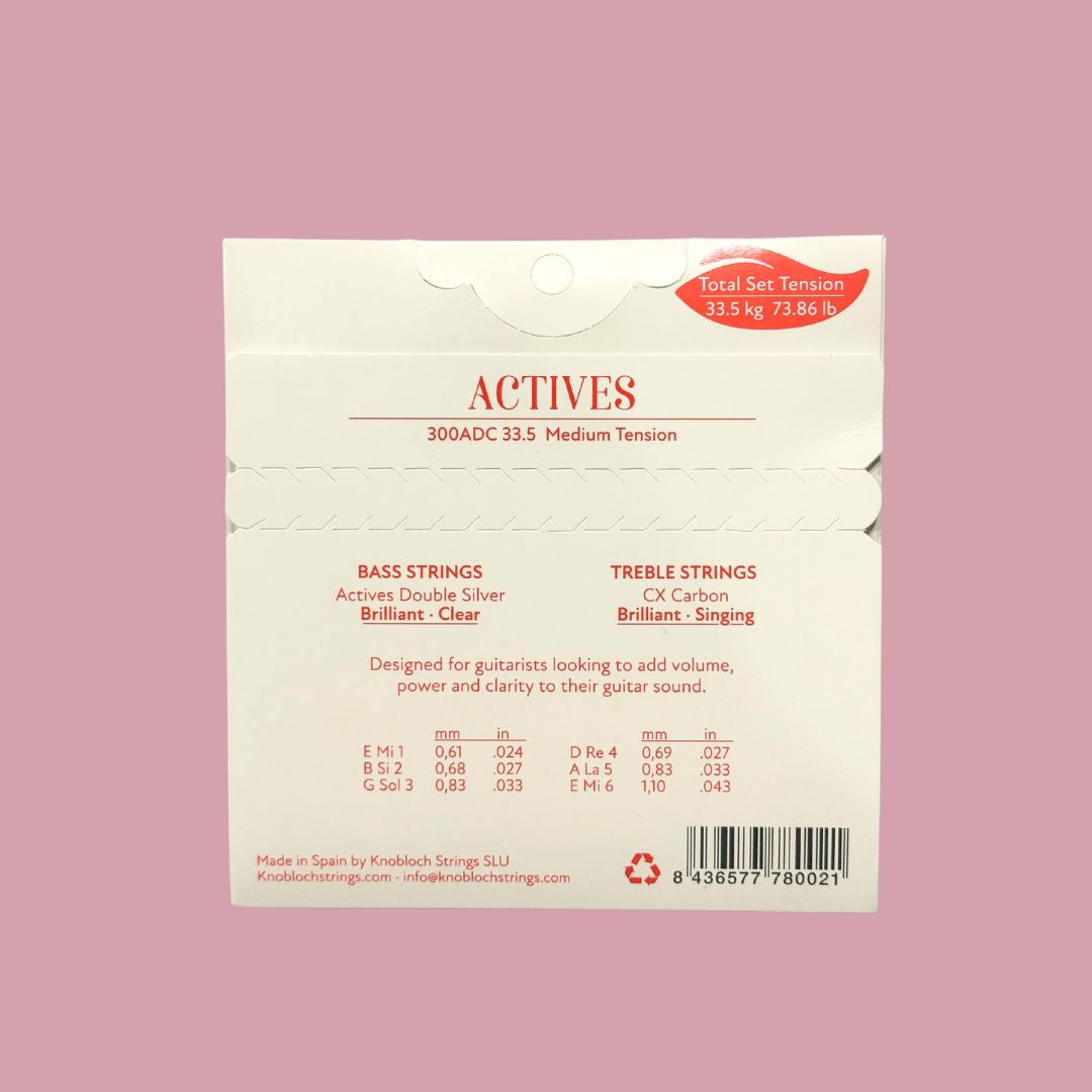 Juego de cuerdas Knobloch Actives CX Carbon 300 ADC, con primas de nylon-carbono y bordones entorchados Double Silver. Tensión media, sonido potente y equilibrado.